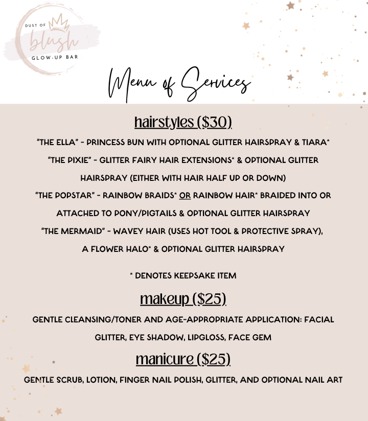Treat your little princess to pampering at our “Dust of Blush” Glow-up Bar.